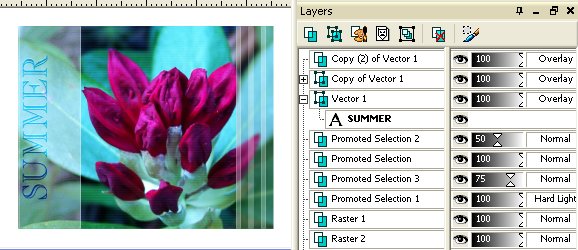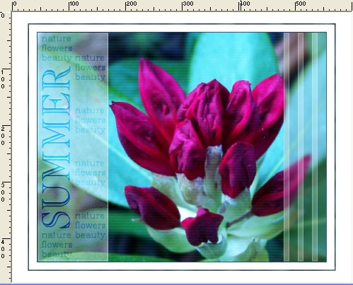 Here the 'Objects / Align' tools are useful. When I was satisfied with the top and bottom text sections to the right (the column with 4 sets of text), I used the 'Objects / Distribute / Vertical Center' function to space these 4 text sections evenly. - When you are satisfied with the placement of your text, go to 'Layers / View / None'. Then make only the last 6 vector text layers visible - the layers with the text 'nature, flowers, beauty' (click on the 'eye' for each of these layers). Then go to 'Layers / Merge / Merge Visible'. Change the 'Blend Mode' of this new 'Merged' layer to 'Overlay'.