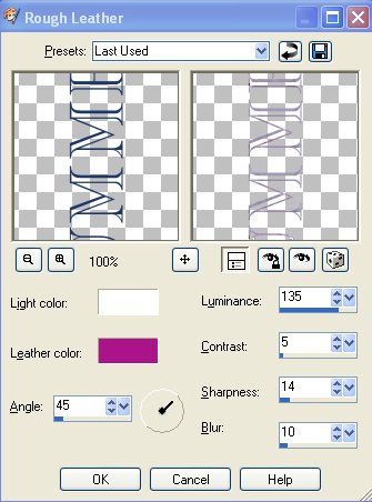 - With the top text layer (raster) active, go to 'Effects / Texture Effects / Rough Leather' and use these settings (Leather color = '#aa1488'):