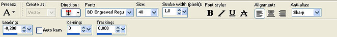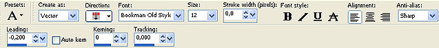 - Activate the top layer. Activate the 'Text Tool'. Close the foreground color. Set the background color to a dark color from your image. I used #1c3768. Use these settings: