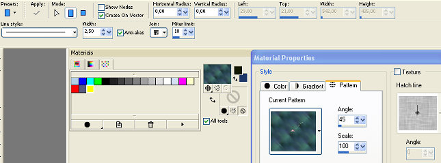 - Go to the 'Materials Palette'. Close the background. Click on your foreground, then choose 'Pattern'. Locate the seamless tile in the category 'Open Images'. Use these settings: